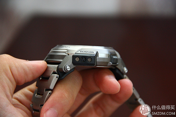 靠左的是传感器,可以看到表链上的划痕挺明显,截了三块表带,第一次戴上它时被它的重量惊呆了,特别轻,和外表相差很大,一个相当大的优点,特别是习惯每天都戴表的情况下,轻量是有多么重要,太重的话比如打字会让我觉得手腕沉沉的特别不爽,当然松拓也有着轻量的优势,但它是橡胶表带。