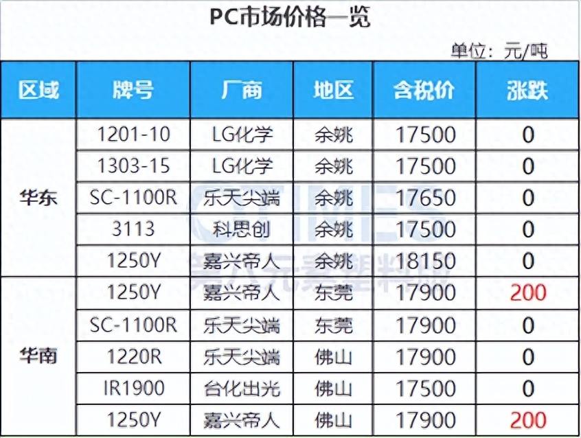 PC各地市场高位运行延续,部分报盘向上,市场低价难寻,实单交投高位谨慎。零星工厂价格上调,涨幅200元/吨。上游产业链延续上涨态势,PC成本重心向上。