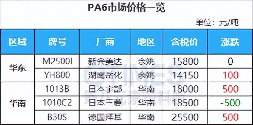 国内PA66市场继续上涨。国内工厂报盘推涨,持货商低价惜售。当前华东地区EPR27市场主流价参考19200-19300元/吨现金。旭化成1300S市场主流价参考26800-27000元/吨现金。