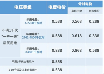 通俗来讲,居民用户当年内累计用电量在第一档电量内(年用电量2760度及以下,相当于每个月可以用230度电),每度电需要0.538元,若采用峰谷电价模式的,低谷时段每度电仅0.288元,高峰时段每度电0.568元;当年累计电量达到第二档电量后(年用电量2761-4800度,相当于每个月用电量达到231-400度电),每度电需要0.588元,若采用峰谷电价模式的,低谷时段每度电仅0.338元,高峰时段每度电0.618元;当年累计电量达到第三档电量(年用电量4800度以上,平均每月用电量超过400度)后,每度电需要0.838元,若采用峰谷电价模式的,低谷时段每度电0.588元,高峰时段每度电0.868元。