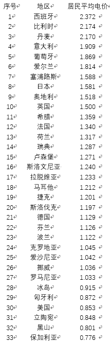 欧洲各国电价数据来自欧盟统计局2019年数据;
