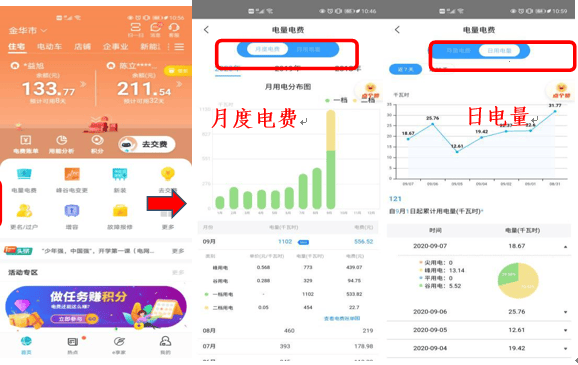点击首页的“电量电费”按钮,可以看到每月用电的详细情况;点击中间蓝色部分的”日用电量”进行切换,可以查看家里每天的详细用电情况。点击年份按钮进行,可以查看之前年份的用电数据。