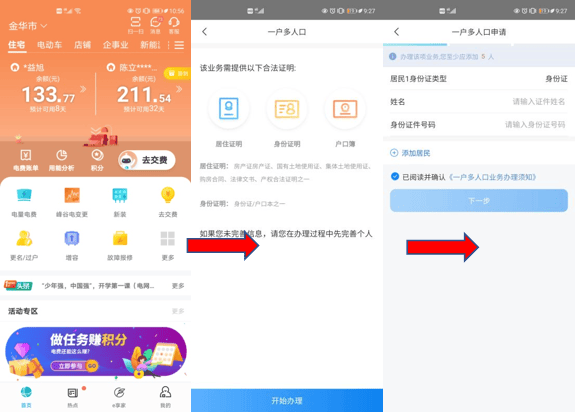 点击首页住宅场景中的“更多”按钮,选择“办电”,点击“一户多人口”按钮,按照收资规范提交相关材料即可办理。