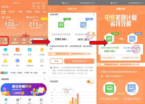 点击首页住宅场景中的“用能分析”按钮,可以查看未执行峰谷分时和执行峰谷分时的电费比较。
