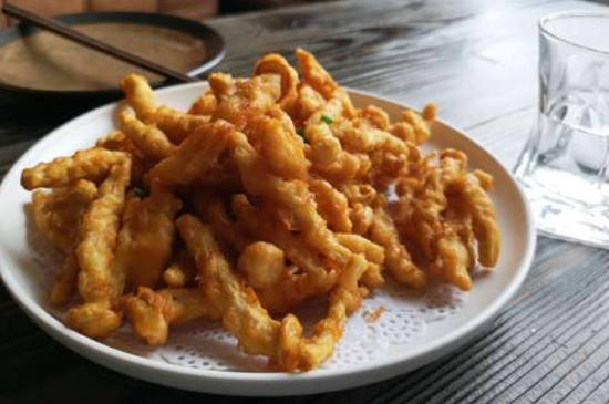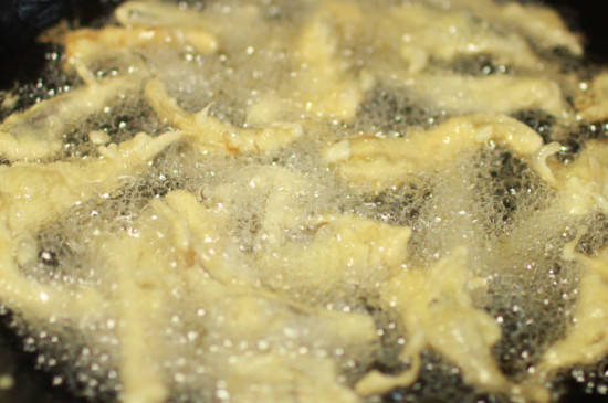 需要注意面糊要完全调匀,面糊内不要出现干面粉粒,这种面糊不仅会影响炸鲜蘑的美观性,在炸制过程中还会导致锅内的热油花爆出,可能会导致操作人员出现烫伤的现象。