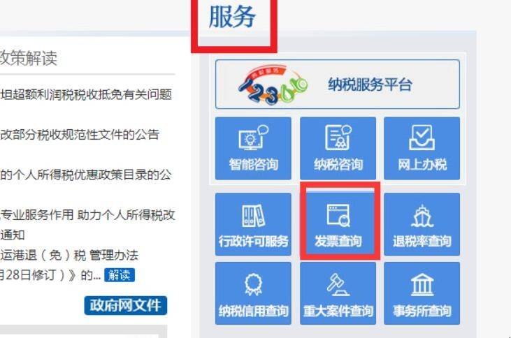 2、在国家税务总局官网内找到“服务”下面的“发票查询”,并点击进入。