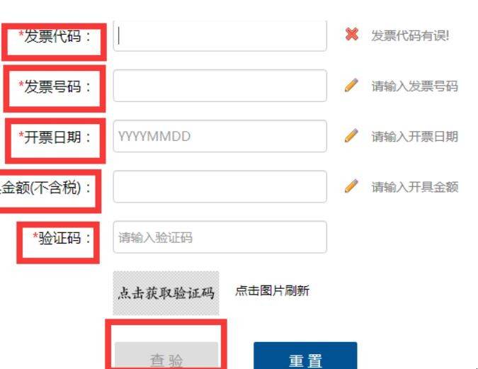 3、在发票查询页面下输入正确的发票代码、发票号码、开票日期、开具金额(不含税)、验证码后点击“查验”。