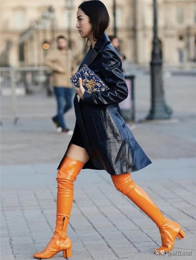 也特别受欢迎,比如橘黄色的包包和靴子,可以用来点缀整个穿搭。
