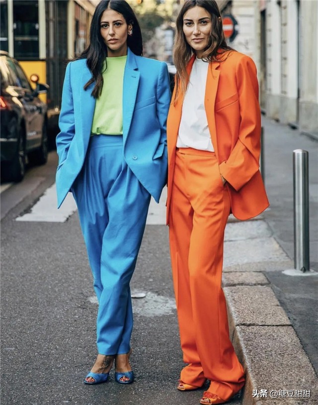 ,如橘黄色的西装套装。除了同色系的搭配方式之外,
