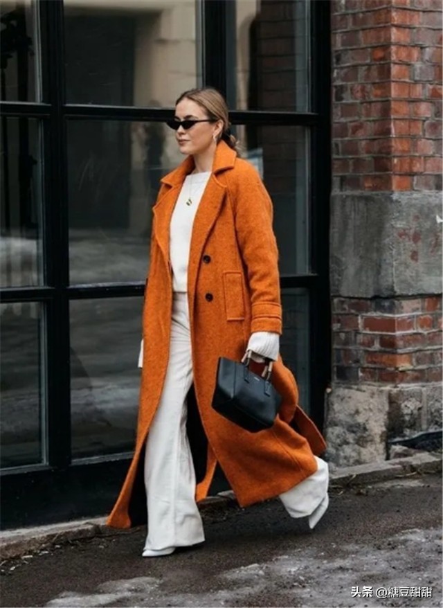 比如穿件橘黄色的大衣,搭配白色的针织衫和白色的裤子,整个穿搭显白又显气质好。