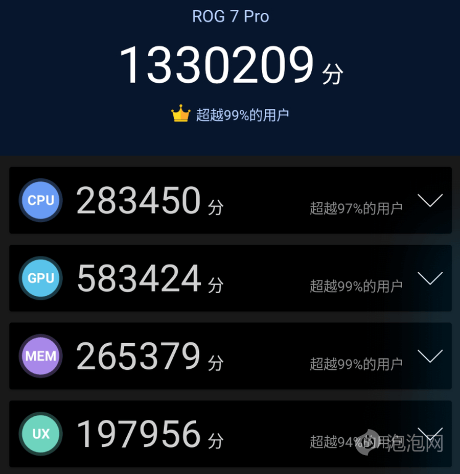 通过安兔兔测试,腾讯ROG游戏手机7 Pro最终得分达到了1330209分,这样的分数也要优于一众旗舰手机,具备强劲的性能表现。