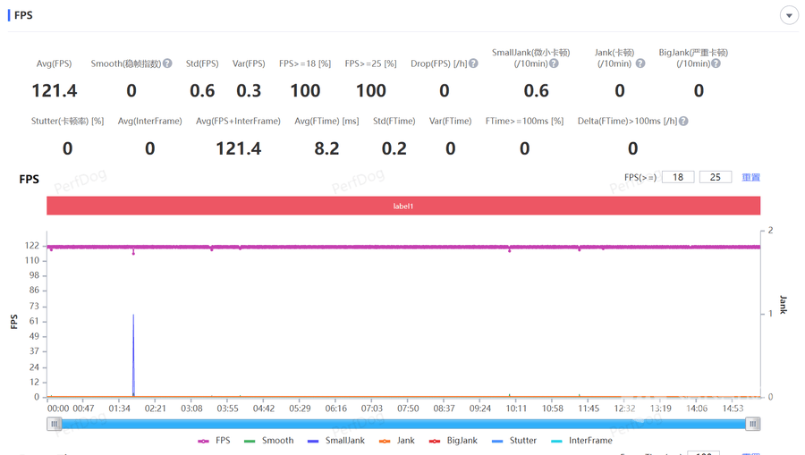 《王者荣耀》在腾讯ROG游戏手机7 Pro上可以设置为极高帧率,我们使用PerfDog来对手机的游戏帧率进行测试,经过一局游戏,腾讯ROG游戏手机7 Pro运行《王者荣耀》的平均帧率为121.4FPS,在整个游戏过程中画面流畅,可以明显感受到超高帧率带来的游戏体验升级。