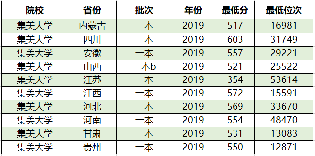 集美大学2019年理科二本各省录取分