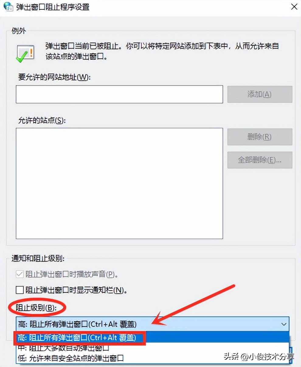 在【设置页面】中,我们直接把【弹出窗口阻止级别】更改为【高】