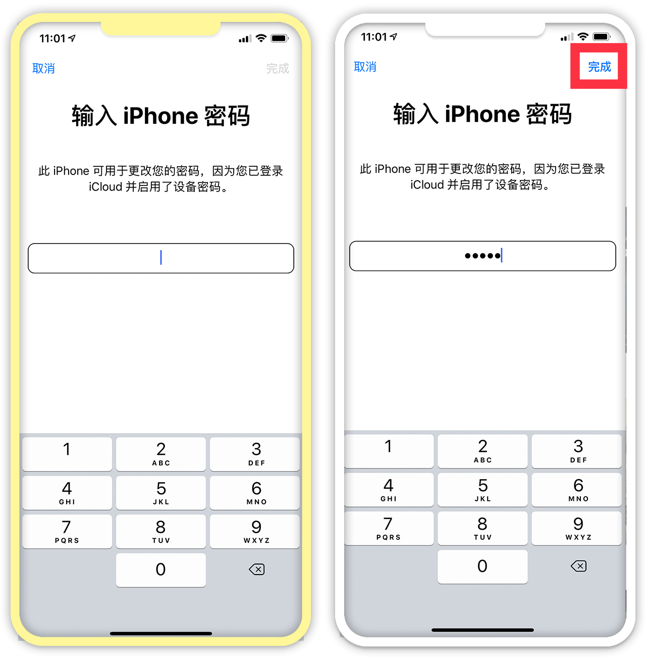 2、这时候系统会要求你输入一遍锁屏密码,输入验证完点击右上角的「完成」来继续。