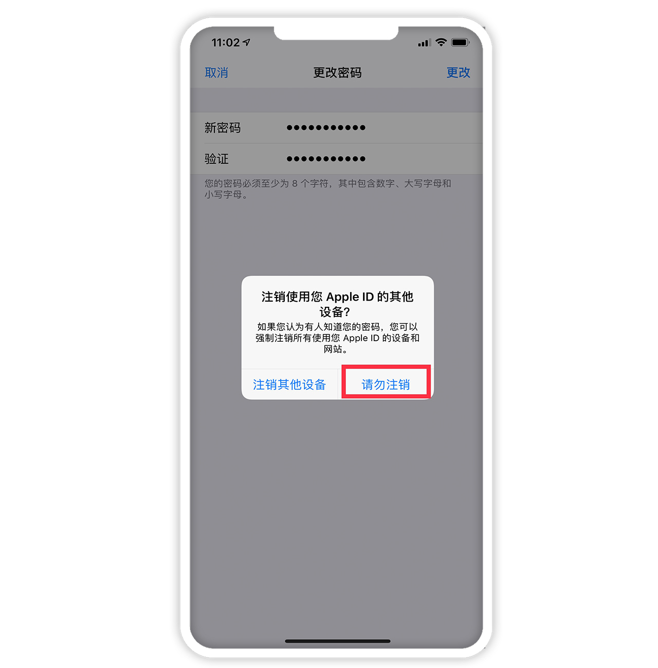 4、点击「更改」后,会弹出询问框选项,是否要移除使用过Apple ID 的其他设备,点击「请勿注销」即可。这样你的 Apple ID密码就被更改成功了。Apple ID就可以使用更改后的新密码了。