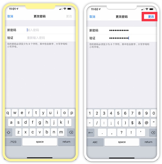 3、这时候会弹出页面,让你直接输入 Apple ID 新密码,也就是说无需输入任何答案或者其他验证,直接输入两遍的新 Apple ID 密码即可,点击右上角的 「更改」即可。注意:「新密码」和「验证」都是输入相同的新密码。