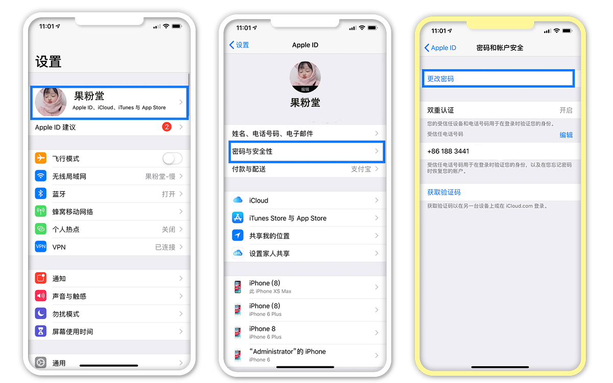 1、打开手机的「设置」,点击设置顶部的 Apple ID 入口。如下页面在ios11以上都有的。在Apple ID 页面中点击「密码与安全性」,进入后,点击「更改密码」。