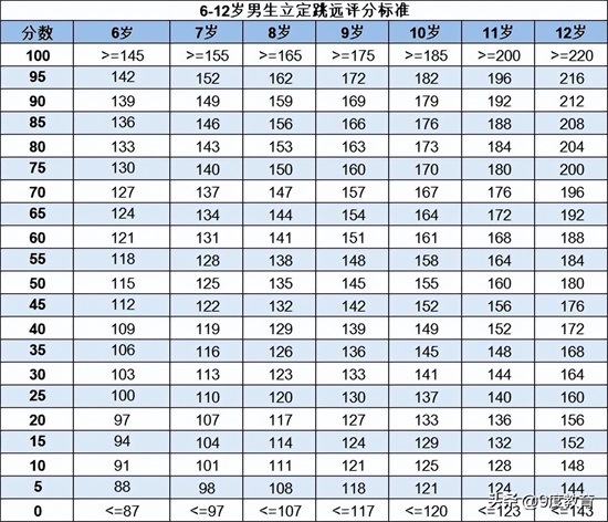 立定跳远分数从0-100分,每个分数对应立定跳远的距离。一般6岁或者7岁上一年级,二年级到六年级,可以按照年龄往上推算。