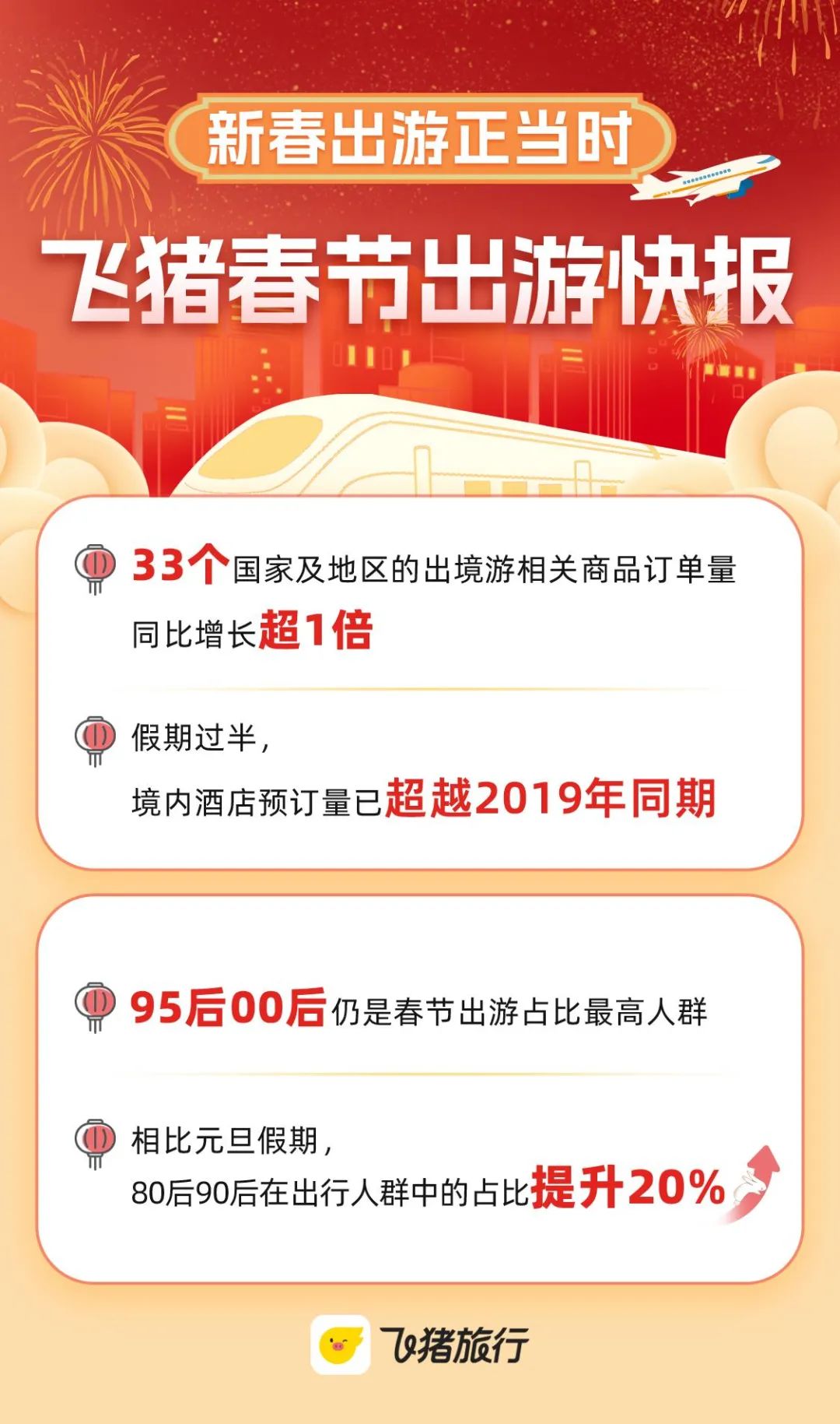 疫情防控进入新阶段后,重归旅途的95后、00后先耍完一圈,80后、90后紧随其后走出家门。飞猪数据显示,今年春节期间,95后、00后仍是主要出游人群,而80后、90后在春节出游人群中的占比相比元旦假期上升了20%。越来越多不同年龄层的人群加入了春节出行的队伍。