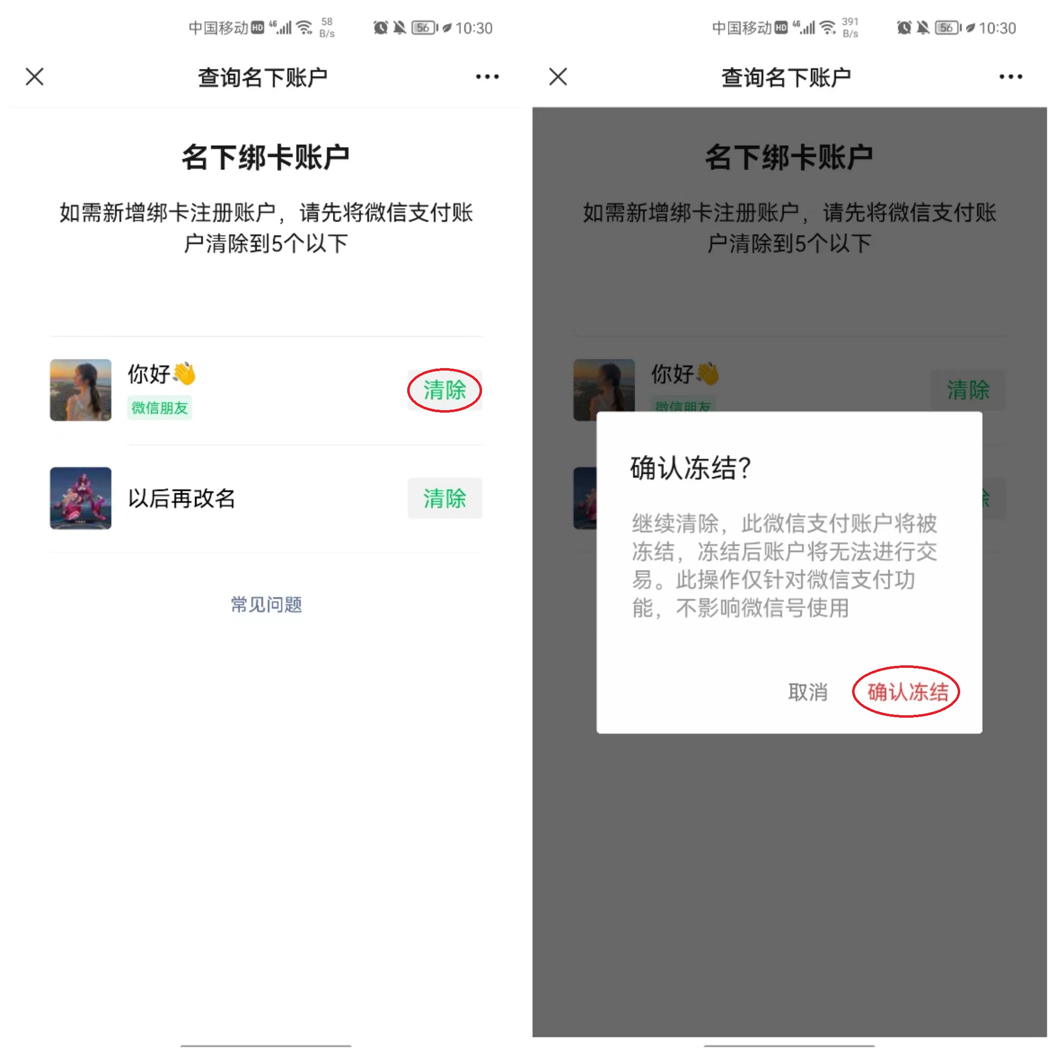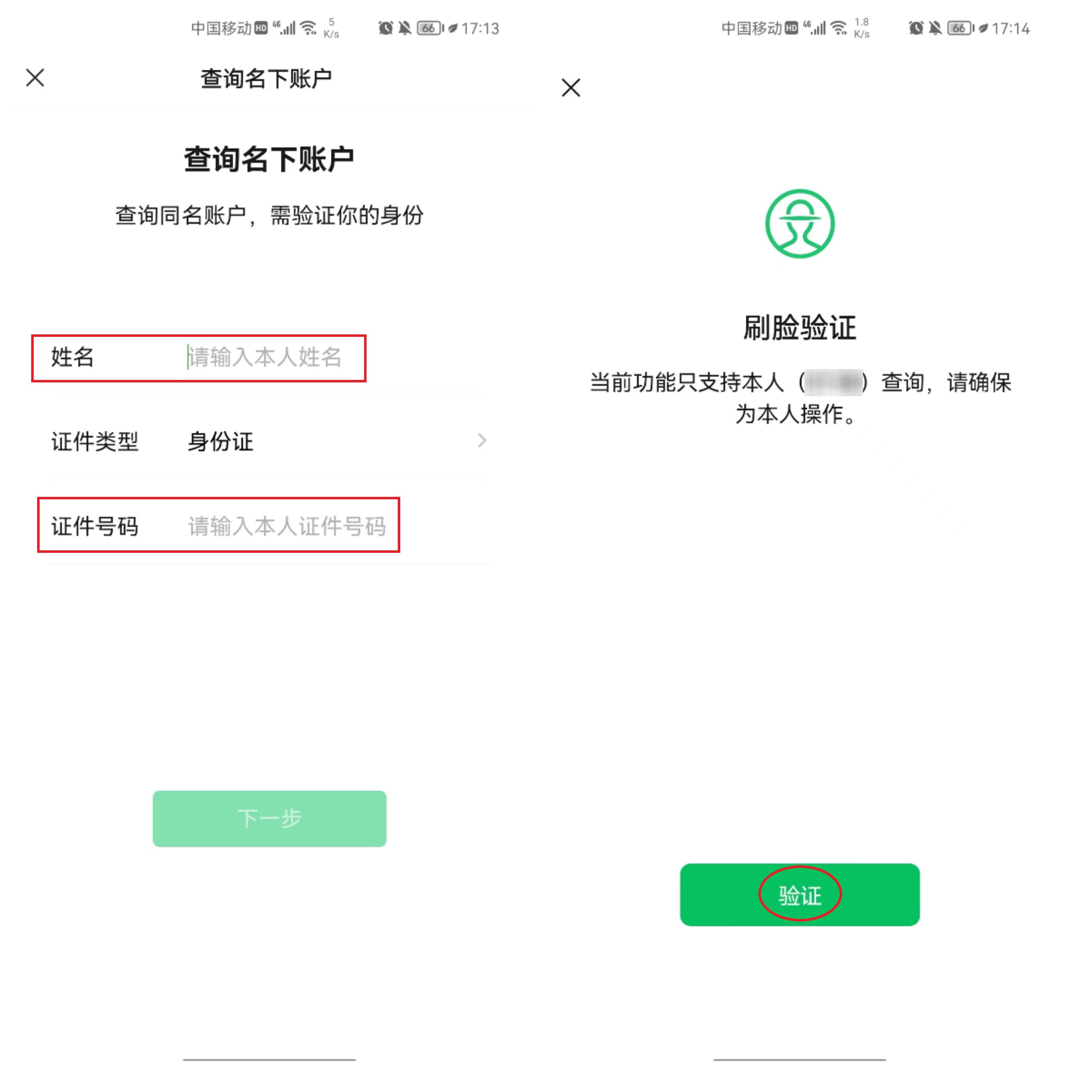 4.随后点击【查询名下账户】,一个身份证最多可以绑定5个微信账户;