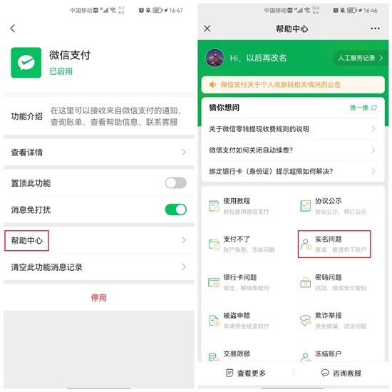 3.接着在微信支付功能界面,点击【帮助中心】,找到【实名问题】;
