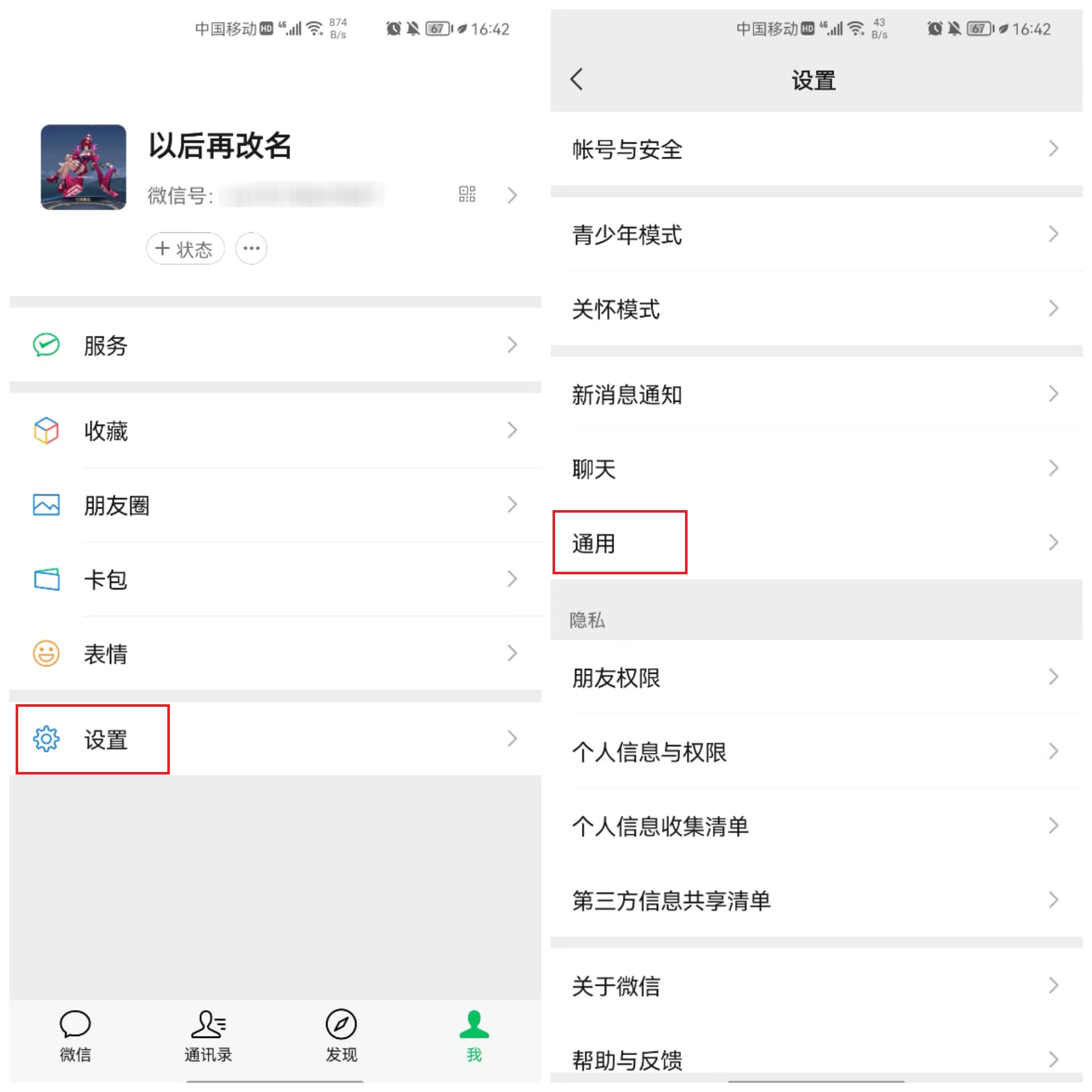 1.首先打开微信,点击右下角的【我】,进入【设置】,再点击【通用】;