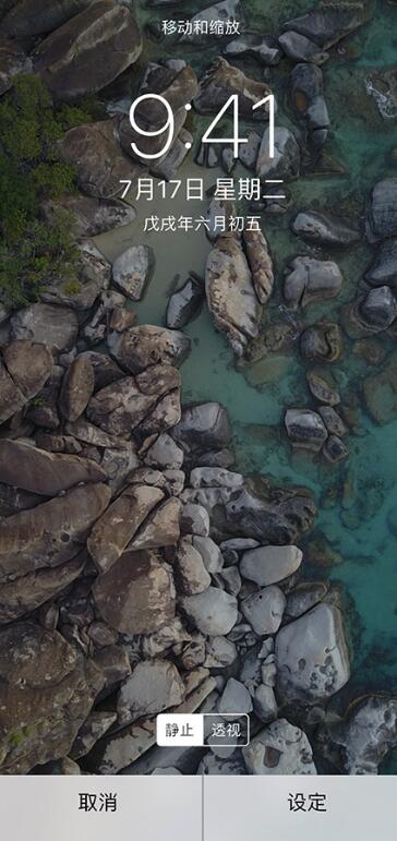 ,旁边的另一个图标代表照片视角缩放,也就是此前 iOS 12 中的静止/透视选项,“透视”状态下,墙纸会随着您倾斜屏幕而移动,“静止”状态下墙纸就不会移动。实况与透视无法同时开启。