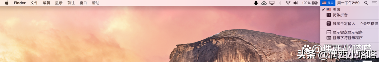 1、macbookpro碰触下最上方菜单,菜单右侧即可看到输入法,如下图点击输入法:
