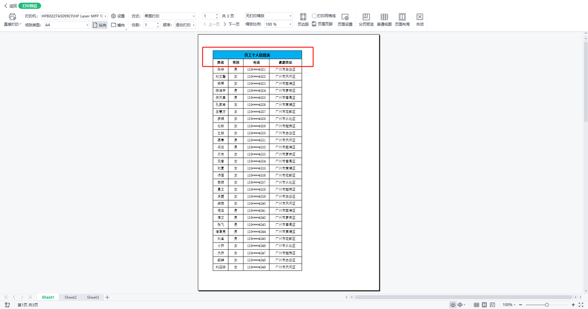 6、这时,我们可以看到打印预览中每页都有表头了,我们再点击表格左上方的“直接打印”按钮,打印出来的表格每页都是有表头的了;