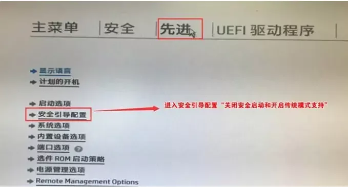 3.回车后,将配置传统支持和安全引导设置电脑“启用传统支持和禁用安全引导”以及去掉“启用MS UEFI CA密钥”前面的勾,然后按F10保存更改。