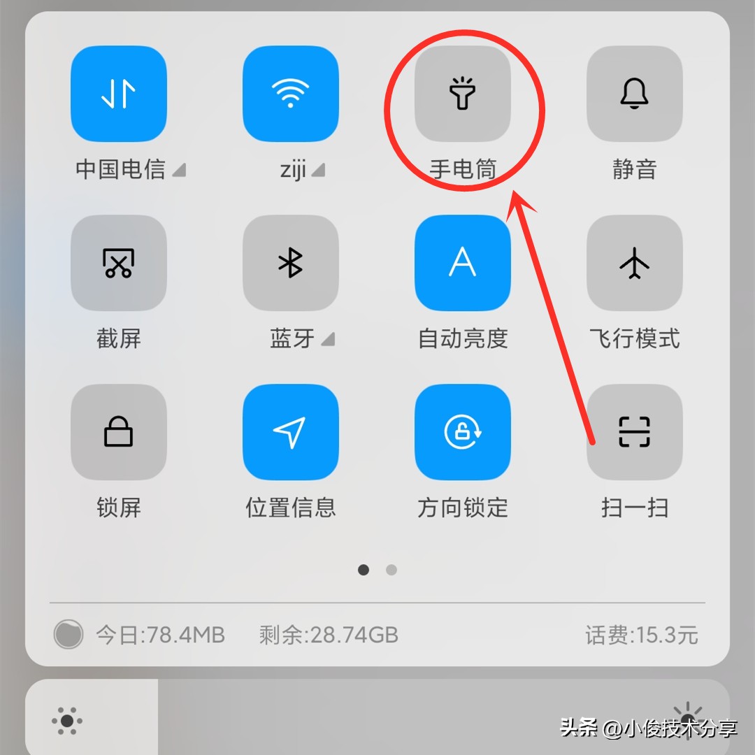 很多朋友在使用手机手电筒的时候啊,相信都是直接把手指移到屏幕上方,然后点击【手电筒】,接着再锁屏,这样就可以使用手电筒了对吧,关闭的时候呢,也是再次点击【手电筒】把它关闭,重复刚才的步骤,但是如果说我们使用次数多的话,会觉得这样操作非常繁琐,而且很费电,其实啊这上面隐藏了一个小机关,很多人还不清楚!