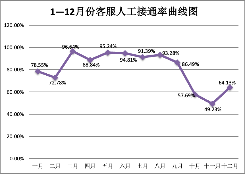 本月人工接通率为64.13%,人工接通率环比上升30.27%。1-12月人工接通率对比情况如图所示: