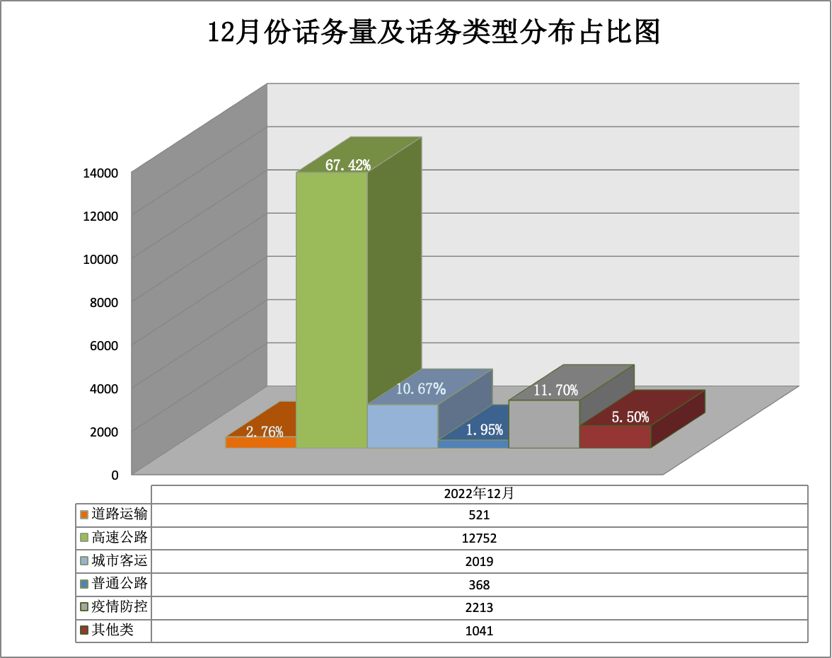 按业务领域划分,本月共受理道路运输类电话521件,占话务总量的2.76%;高速公路类电话12752件(不包含高速公路出口检疫点疫情管制),占业务总量的67.42%;城市客运类电话2019件,占业务总量的10.67%;普通公路类电话368件,占业务总量的1.95%;疫情咨询类电话2213件,占业务总量的11.70%;其他类电话1041件,占业务总量的5.50%。