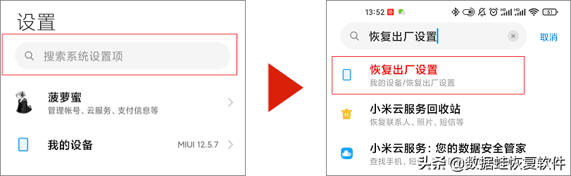 也可以打开【设置】后直接在搜索框内输入“恢复出厂设置”,这样也可以打开这个功能。