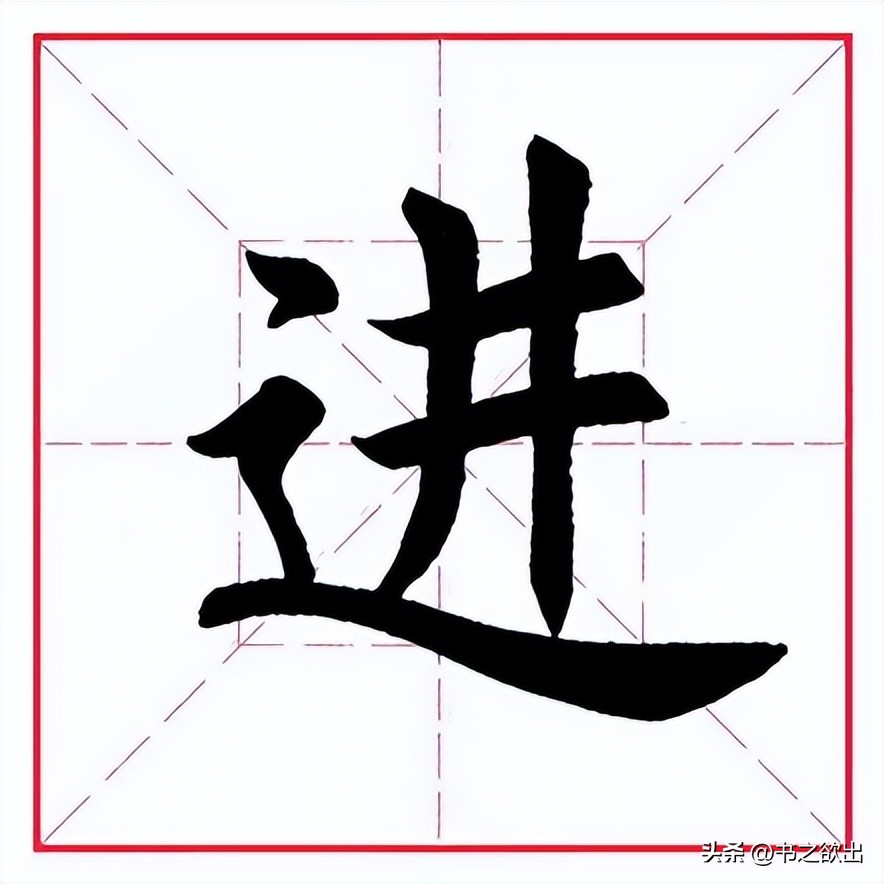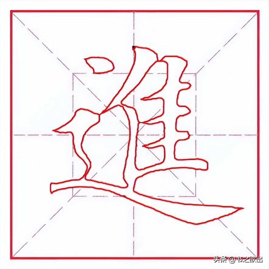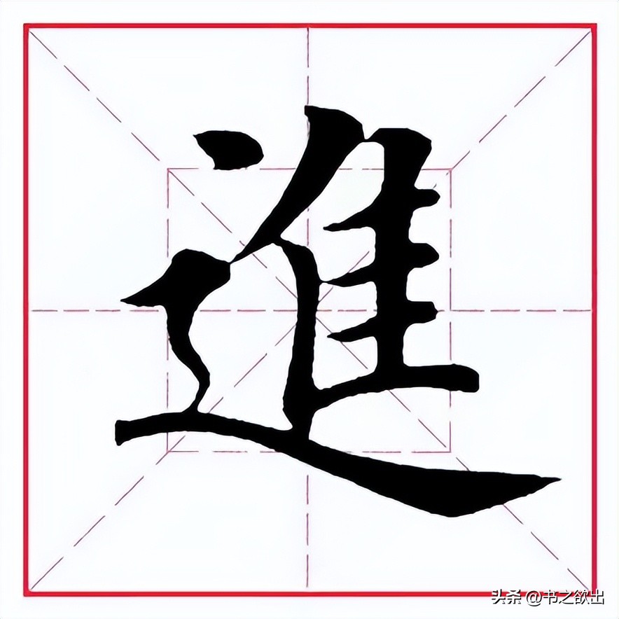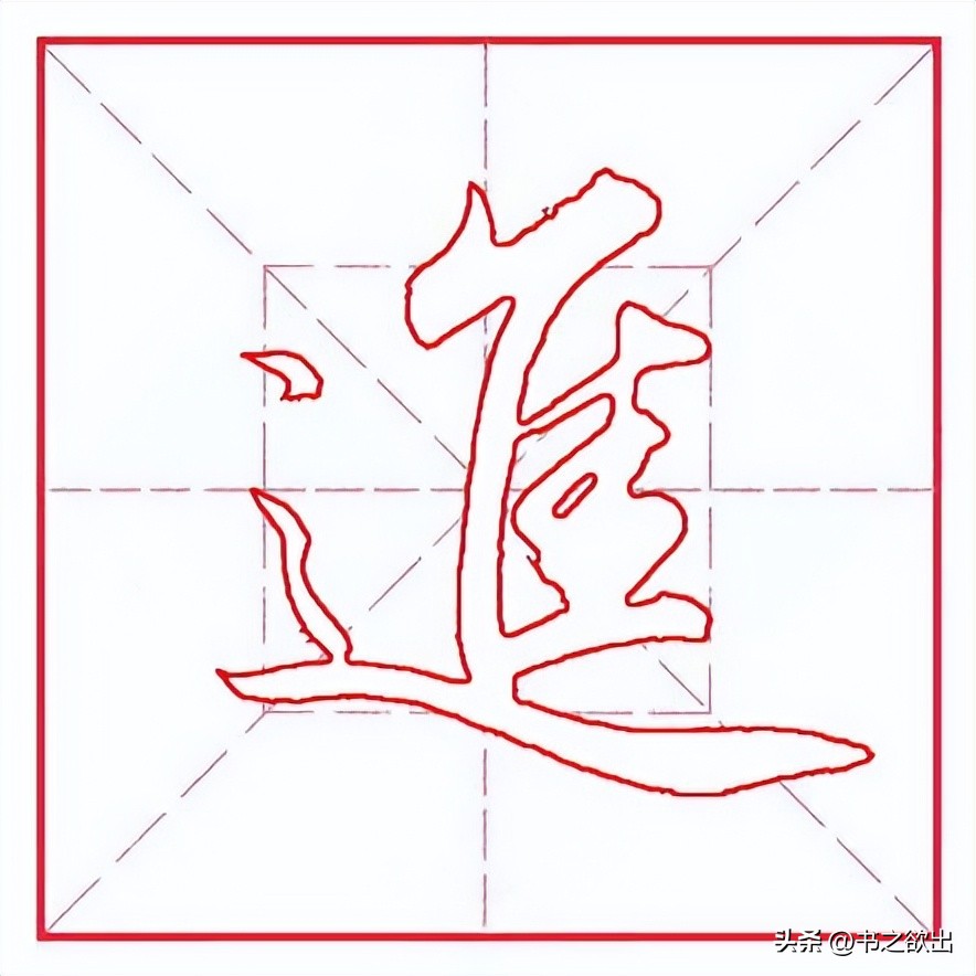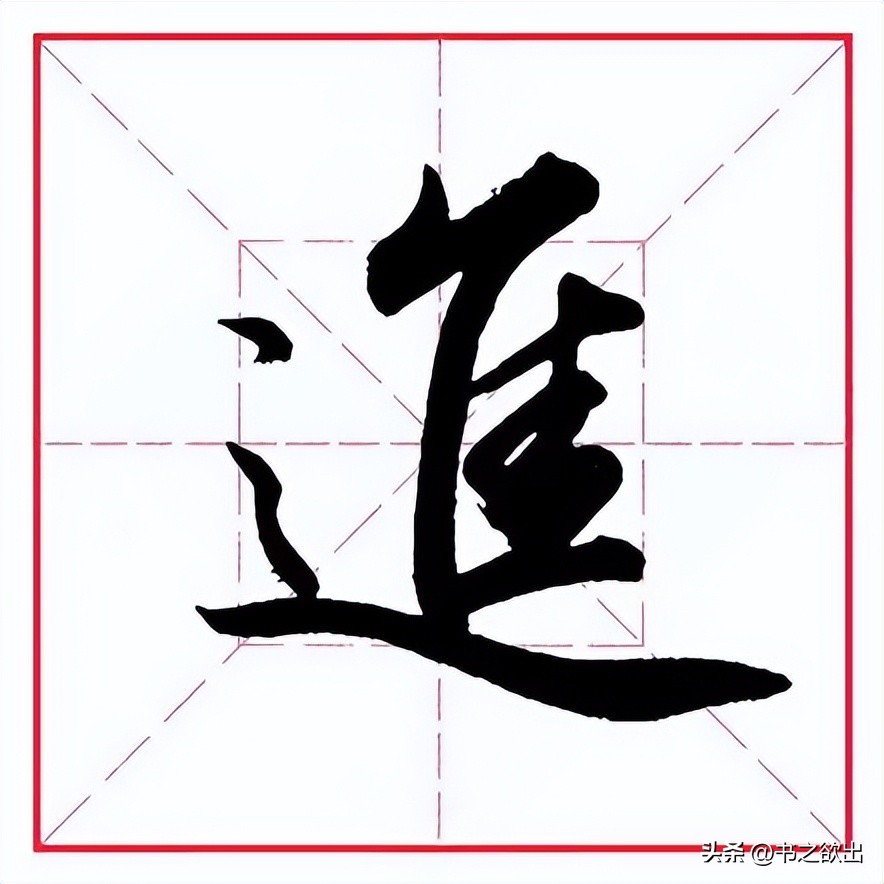 “辶”首点起笔与右边竖点基本平齐,与右部距离勿远,饱满圆润,收笔向左下方稍出锋呼应下画;横折弯钩起笔靠左,靠下,横画大抗肩,勿长,然后向右下方顿笔随即回锋走个“S”弯,注意轻重变化;平捺以藏锋起笔,一波三折,最后捺尖稍平。