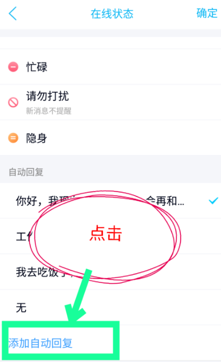选择离开状态后,底部就会有自动回复,滑动到最下面,点击添加自动回复。如图