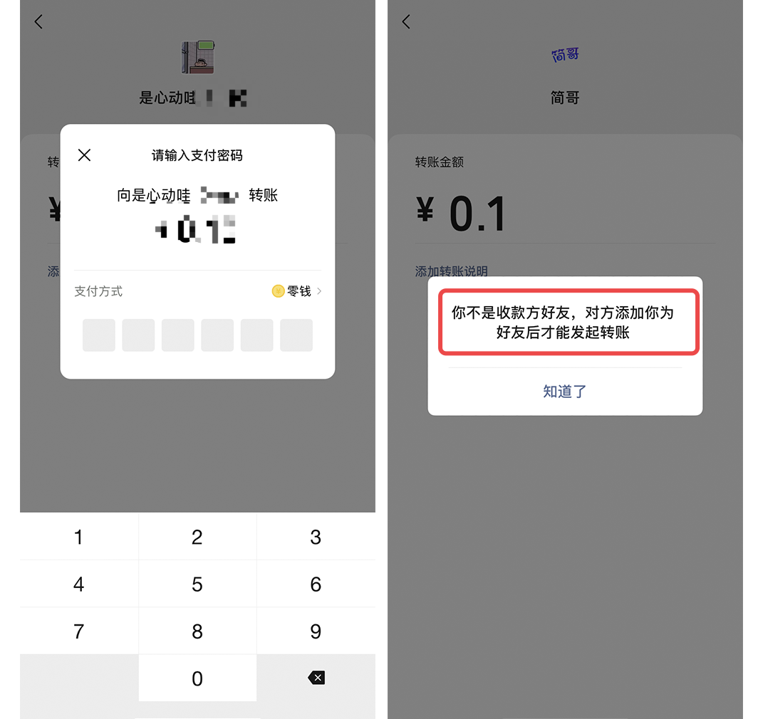 另外我们还能通过微信转账进行测试,当我们在给好友转账时,如果对方没有将你删除,那么我们是可以直接进行密码输入的,但如果对方已将你删除,那么我们在输入密码前就会收到提示。
