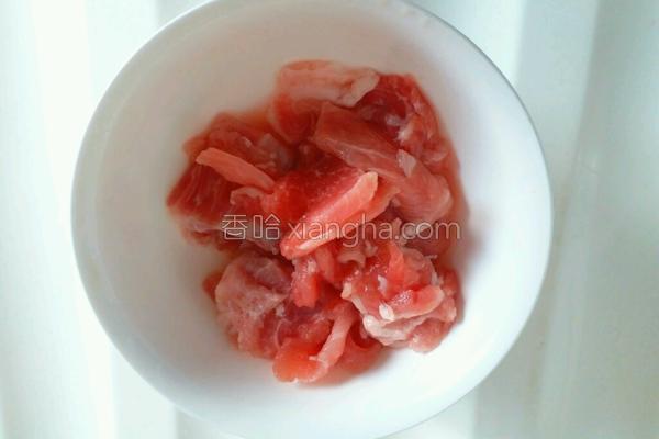 2、把猪瘦肉切成薄片,放入适量盐、水淀粉、生抽,拌匀。
