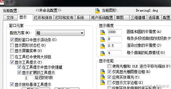 3.打开选项命令后弹出如下图的对话框,通过选项可以对CAD的一些功能进行相关的设置。