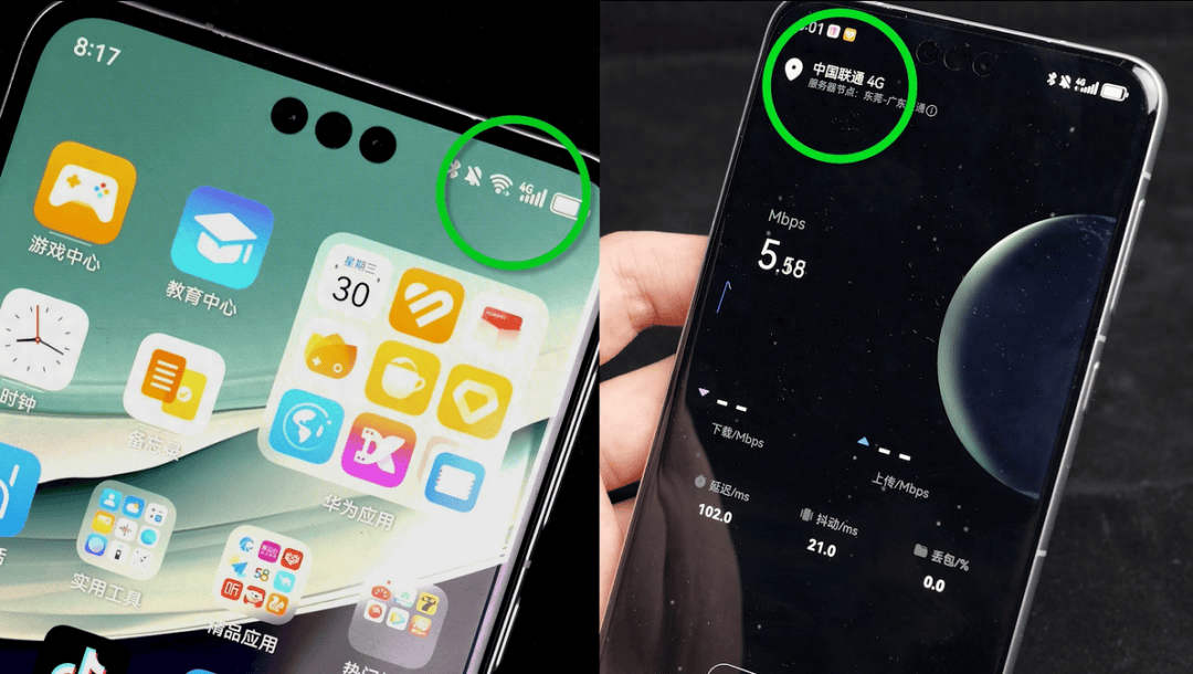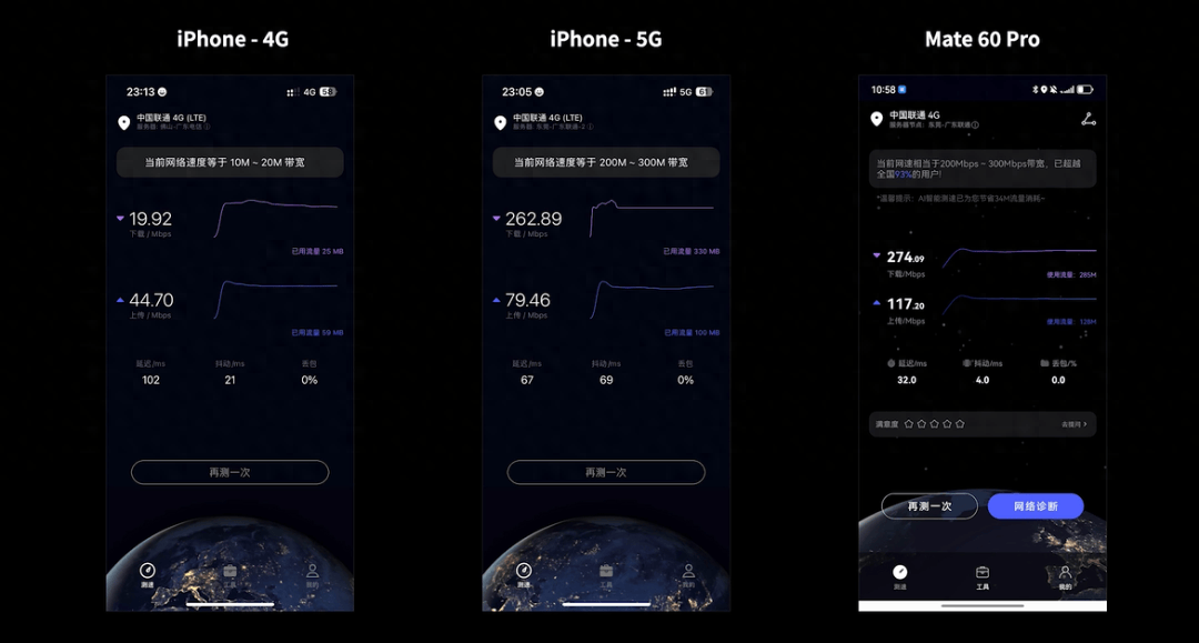 所以我们就使用同一张 SIM 卡,分别在 iPhone 的 4G 模式与 5G 模式下,和 Mate 60 Pro 测速。