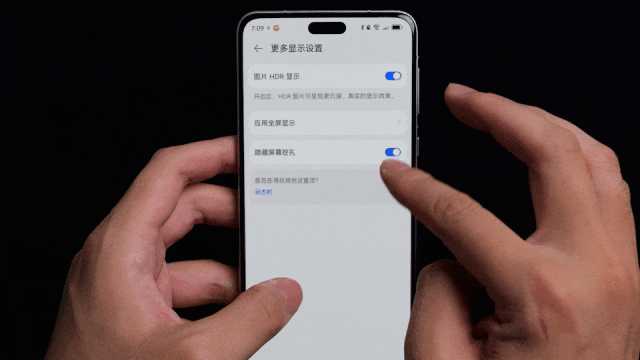 不过相信各位最关注的还是由于加了 3D 结构光而变成的三挖孔,但是别担心,华为估计也考虑到这种设计会让用户感到不适,所以你可以在设置中搜索挖孔,直接把它变成苹果的灵动岛,这样看起来会更顺眼一点。