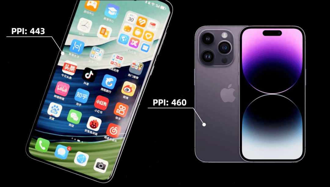 Mate 60 Pro 的正面采用了一块 6.82 英寸的 OLED 屏幕,比 iPhone 14 Pro Max 的 6.7 英寸更大,但是因为分辨率低了一些,所以 PPI 只有 443,而后者是 460。