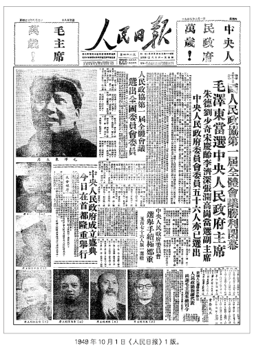 这天的《人民日报》头版头条新闻是新华社9月30日电讯:《中国人民政协第一届全体会议胜利闭幕毛泽东当选中央人民政府主席朱德刘少奇宋庆龄李济深张澜高岗当选副主席中央人民政府委员会委员五十六人亦已选出》。版面左上方刊登了毛泽东的大幅照片,左侧和下方是朱德等6位副主席的照片。