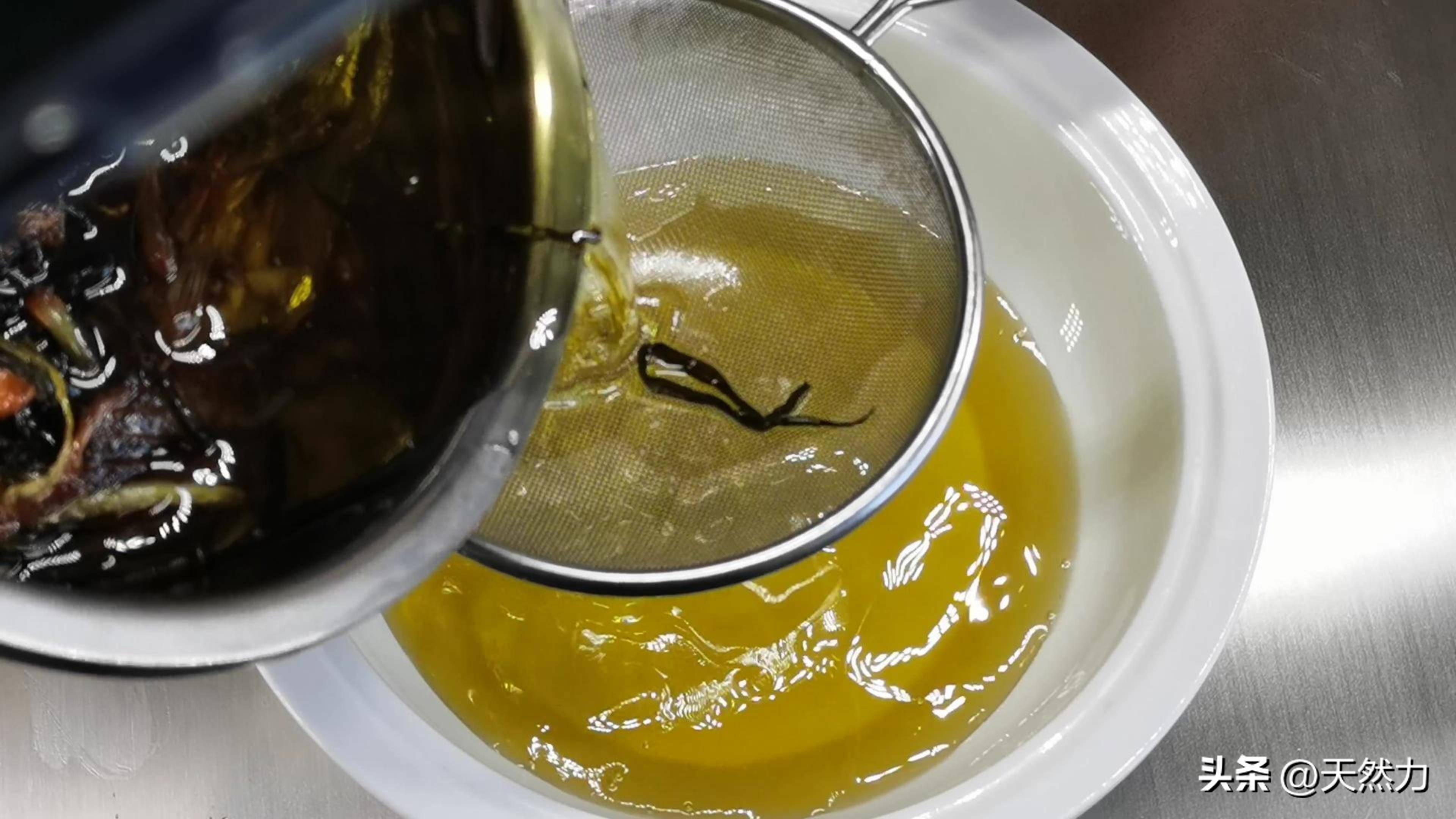 8、最后我们把所有的料渣都过滤掉,这样我们就得到一个纯正的,香喷喷的葱油。