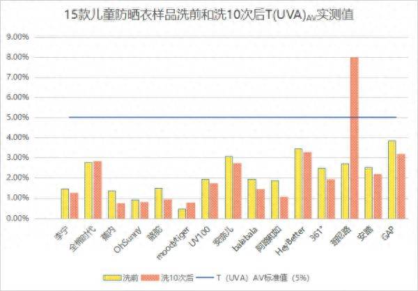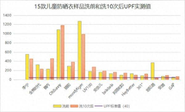 针对市民的疑问,实验室还加测了样品洗涤6次和洗涤10次后的防紫外线性能。结果显示,6次后,班尼路(儿童款)、爱彼兔(成人款)品牌样品防紫外线性能有所减弱,洗涤10次后凯乐石(成人款)样品防紫外线性能也有所减弱。