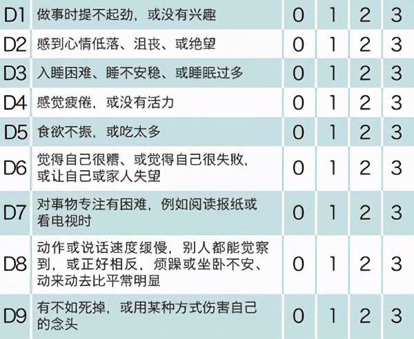 根据《中国精神障碍分类与诊断标准第3版》,抑郁症患者一般会出现9种心情低落表现,如果发现自己符合至少4项时,需要提高警惕,及时寻求帮助。
