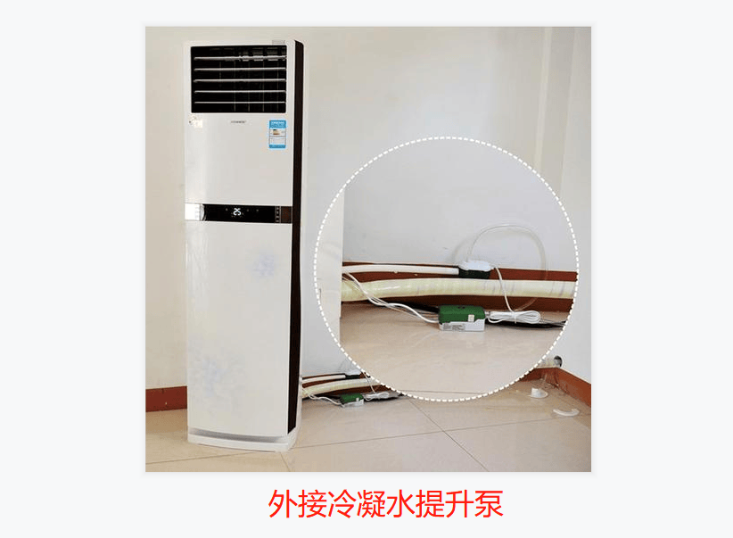 比如按照的柜机是最容易出现这样的问题,因为每台柜机的排水口都不是固定的,而家里的排水口高度却是固定的,所以如果柜机的排水口平行或略高于预留孔洞,应该进行垫高空调,保持排水坡度。