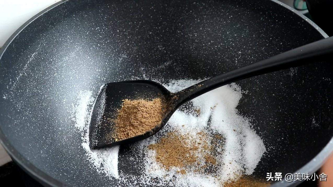 先把炒锅烧热,然后转最小火,加入几勺盐进去。小火把盐炒热以后,再加入同样比例的花椒粉进去翻炒。花椒粉这样炒,能更好的把花椒的味道给激发出来。炒十几秒左右,就能闻到浓郁的花椒香味的时候就关火。椒盐炒好后关火,倒入一个碗里备用。