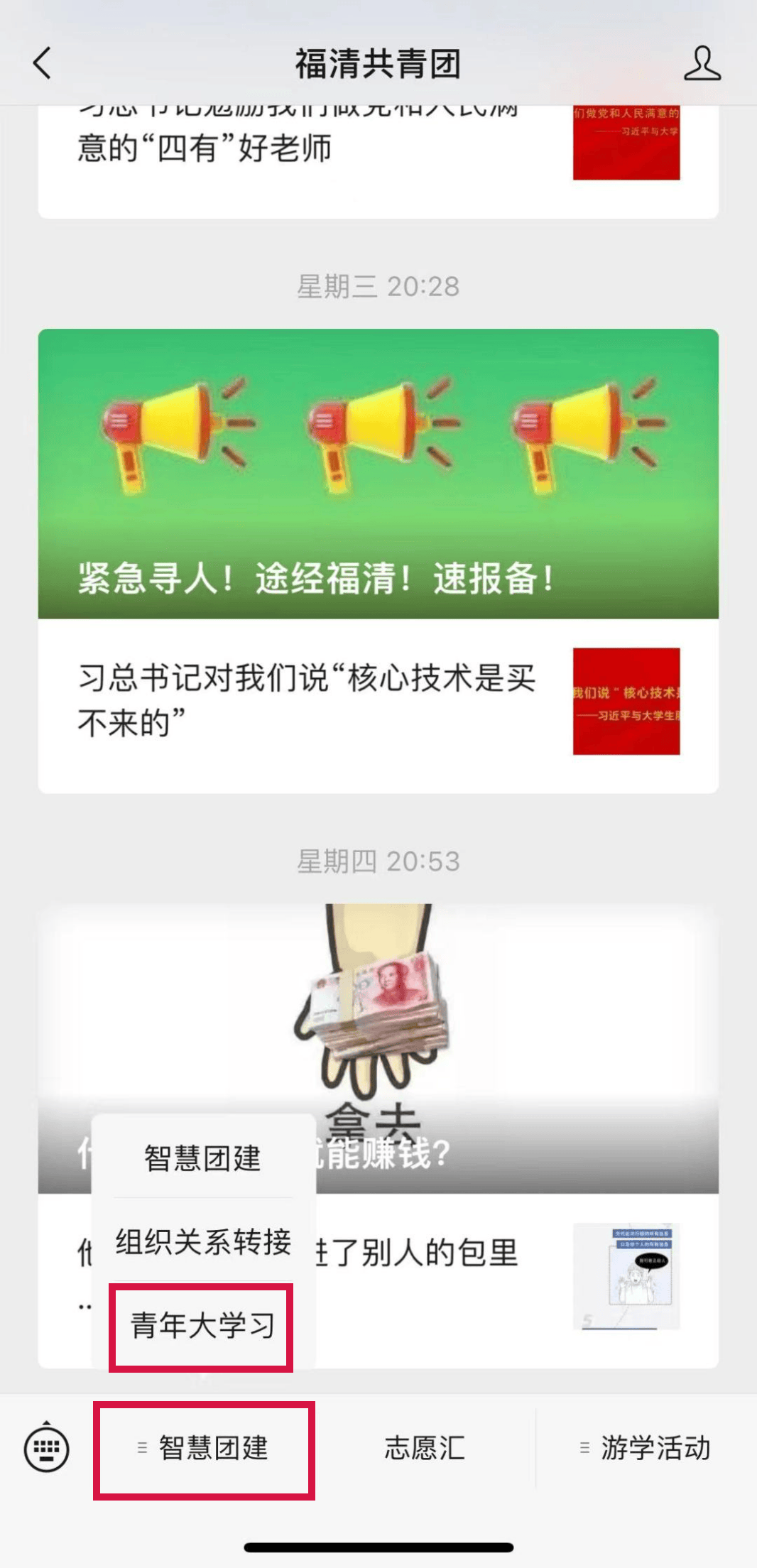 打开微信公众号“福清共青团”进入菜单栏“智慧团建”点击“青年大学习”